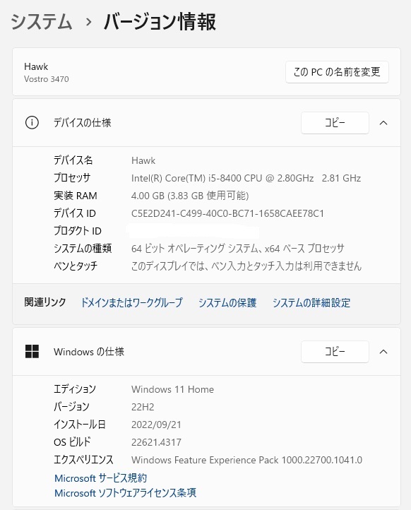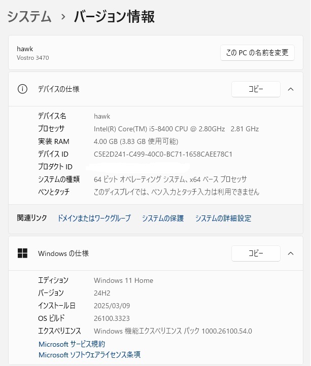 2018年に購入したDellのPC(Vostro3470)ですが、購入当初のWindows10からOSのアップデートを順次行ってきて、Windows11 22H2までは問題なくアップデートできていましたが、22H2以降のバージョンは利用可能な更新プログラムとして降りてこなくなりました。このPCのCPUはインテルCore i5 第8世代なので、Windows11のサポート対象になっています。 ![]() 最新のバージョンにアップデートしなくても使用上特段の支障はないので、そのままの状態で使用してきましたが最近次のようなメッセージが表示されるようになりました。 ![]() この先Windows11 22H2はサポートされなくなるようです。 そこでOSを初期化してみることにしました。 念のため、ディスク(SSD)のクローンBuckupをとっておくことにします。 Raspberry Pi 4にインストールしたUbuntu 24.04LTE を使用して dd コピーを行います。 Raspberry Piにコピー元のSSDとコピー先のSSDをUSB接続し、Gparted等のディスク管理アプリで各SSDをUSBポートから抜き差ししてマウント先を特定します。 #dd if=/dev/sda of=/dev/sdb bs=10M status=progress if はコピー元のSSD、of はコピー先のSSDです。 240MBのSSDを丸ごとコピーするのに約2時間かかりました。 コピー先のSSDをPCに取り付けてWindowsが起動すればOKです。 DellのPCを初期化するには、電源ボタンマークをクリックしてShiftキーを押しながら「再起動」をクリックします。 ![]() ブルー画面が現れて、Windowsの初期化やPCを工場出荷状態へ戻す選択が促されます。今回は完全にクリーンな状態にするため、工場出荷状態に戻す選択をしました。 PCが購入時のWindows10 バージョン1809に戻りました。 Windows10 バージョン2004以降でないとWindows11にバージョンアップできないようです。Windows Updateを行ったところ、Windows10 22H2にアップデートされました。 Windows10 22H2にアップデートしてから半日程度たってからWindows Updateの更新プログラムチェックを行ったら、Windows11 24H2が利用可能な更新プログラムとして降りてきました。 無事Windows11 24H2にアップデートされました。 ![]() |